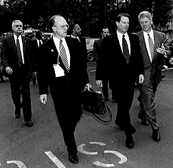 University President William M. Chace accompanied President Clinton and Vice President Gore on a short stroll from Cannon Chapel to the Woodruff P.E. Center.