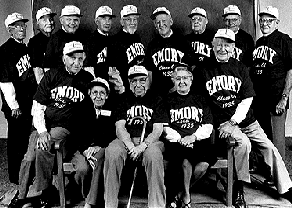The Emory College Class of 1935, celebrating its sixtieth reunion, won this year's H. Prentice Miller Award for the highest percentage of participation of any reunion class in giving to Emory College. Fifty-one percent of the class contributed. Shown here are (back row, from left) Harry Evarts, A.B. Padgett, William Quillian, Douglas Dennis, John A. Griffin, Robert Barnes, W.M. Barnett Jr., Marvin Hardy Jr., and Claude Jordan; (front row, from left) Mendal Segal, Lucile Taylor Crenshaw, Max Rittenbaum, Laura Wilder Hughes, and Marion Brooke.