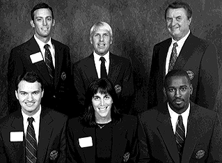 Eleven alumni were inducted into the Emory Sports Hall of Fame at a banquet during Alumni Weekend. Inductees in attendance included (clockwise from top left) James Erin Strauss '88C, a three-time tennis All-American and the national co-winner of the Arthur Ashe Jr. Sportsmanship Award in 1987; varsity soccer standout Robert M. Chandler '70B-'71G, who was soccer coach at Oxford College from 1971-72 and 1994 baseball Coach of the Year at Madison, New Jersey, High School, where he has taught and coached for more than a decade; Edwin C. Pound Jr. '50C-'54M, who won the Bridges Trophy for most outstanding athlete in 1948-49 and who was Southeast AAU wrestling champion in 1949; basketball All-American and two-time UAA player of the year Timothy Darnell Garrett '91C; six-time All-American swimmer Blair Ambach-Nadel '88C; and three-time track and field All-American Gerry Lee Reece '89C.